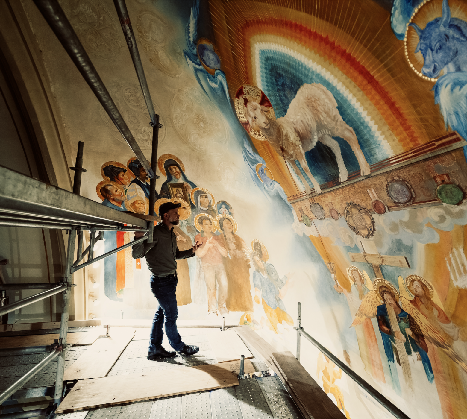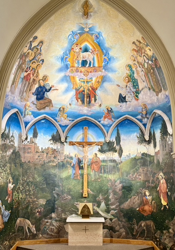 Following Holy Mass, Joseph Macklin will be available for a Q&A. A picture of the artist at work can be seen above. The mural is over 750 square feet and fills the apse of the church behind the sanctuary.
